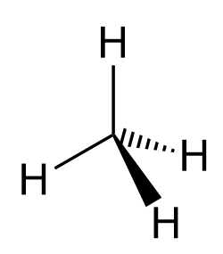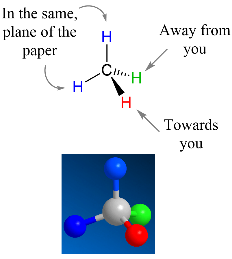 The simplest organic molecule is methane (CH4) where the carbon is sp3-hybridized and has a tetrahedral geometry. To show this geometry, two of the hydrogens are drawn in the plane of the paper, and the other two are pointing toward and away from the viewer. This is where the wedge and dash notation is used: the atoms pointing towards us (in front of the plane) are shown with a wedge line, and the one pointing away (behind the plane) from us is represented with a dashed line: